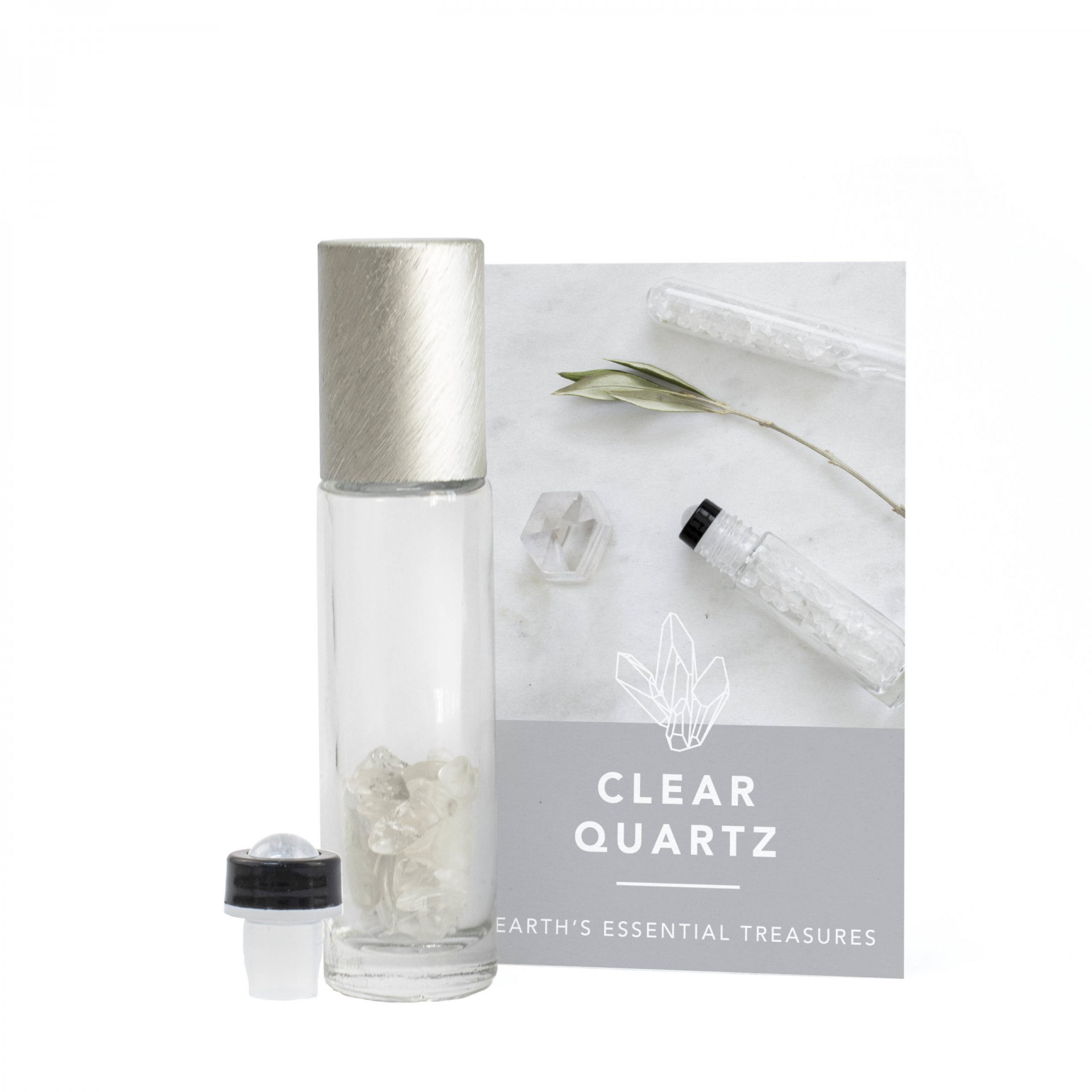 Inclui: 1 roll on transparente 10 ml, 1 tampa aluminio, 1 doseador em quartzo cristal, pequenas pedras quartzo cristal, 1 pequeno cartão detalhando as áreas de bem-estar e emocionais favoráveis ​​a esta pedra assim como os óleos essenciais sugeridos para complementar o seu uso